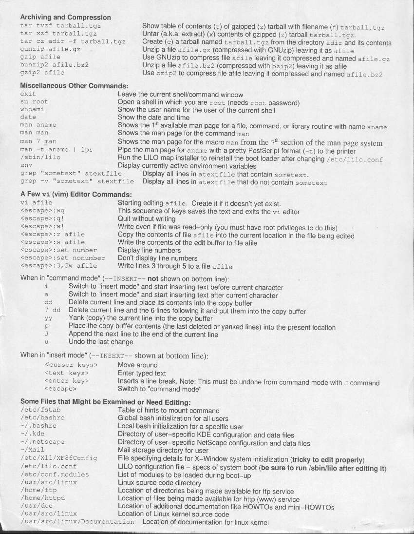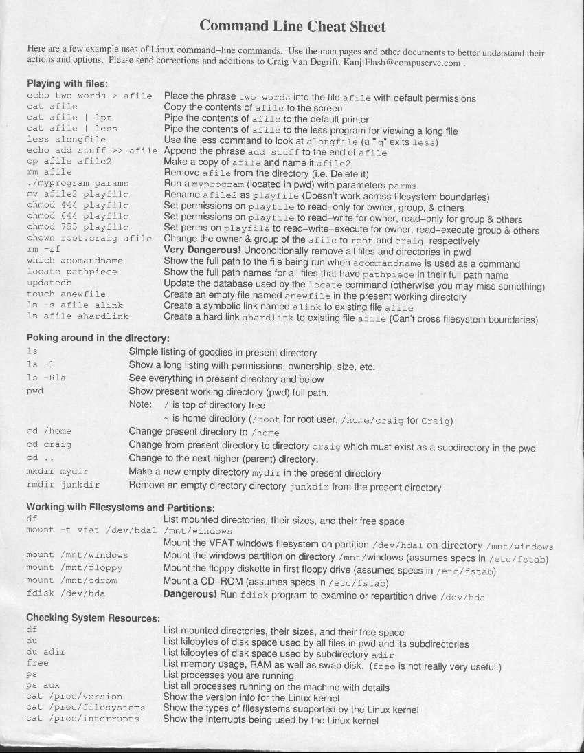 Below are some links to other peoples' "top 10" command sets, and a linux command "cheatsheet" you might print out. Spend some time exploring them.