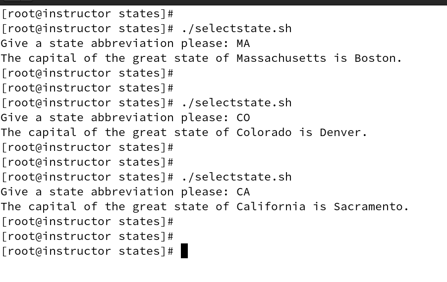 This extends the earlier "functions and file traversal" exercise you did. There, you worked with states.csv and wrote four functions in a script named filetraversal.sh. Here, create a script named selectstate.sh and in it retain those functions. The earlier exercise output a series of 50 lines, each declaring what the capital city of a state is: