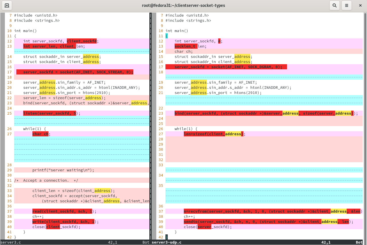 vim -c "syntax off" -d server3.c server3-ip6.c