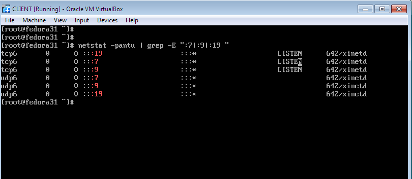 Explanation of the above command - netstat produces a list of the open ports. Its "t" option asks for all the tcp ones, and the "u" option asks additionally for all the udp ones. There are more such ports than the six that interest us. So the lengthier report that netstat produces is handed off through a pipe ( the vertical bar operator ) to a command, namely grep, that will filter out just the 6 lines we want. grep's "-E" option puts it in "extended" mode that enables the compound argument that follows. The vertical bar within that argument is a logical or operator. grep is asked to search for and print lines that contain ":7" or ":9" or ":19".