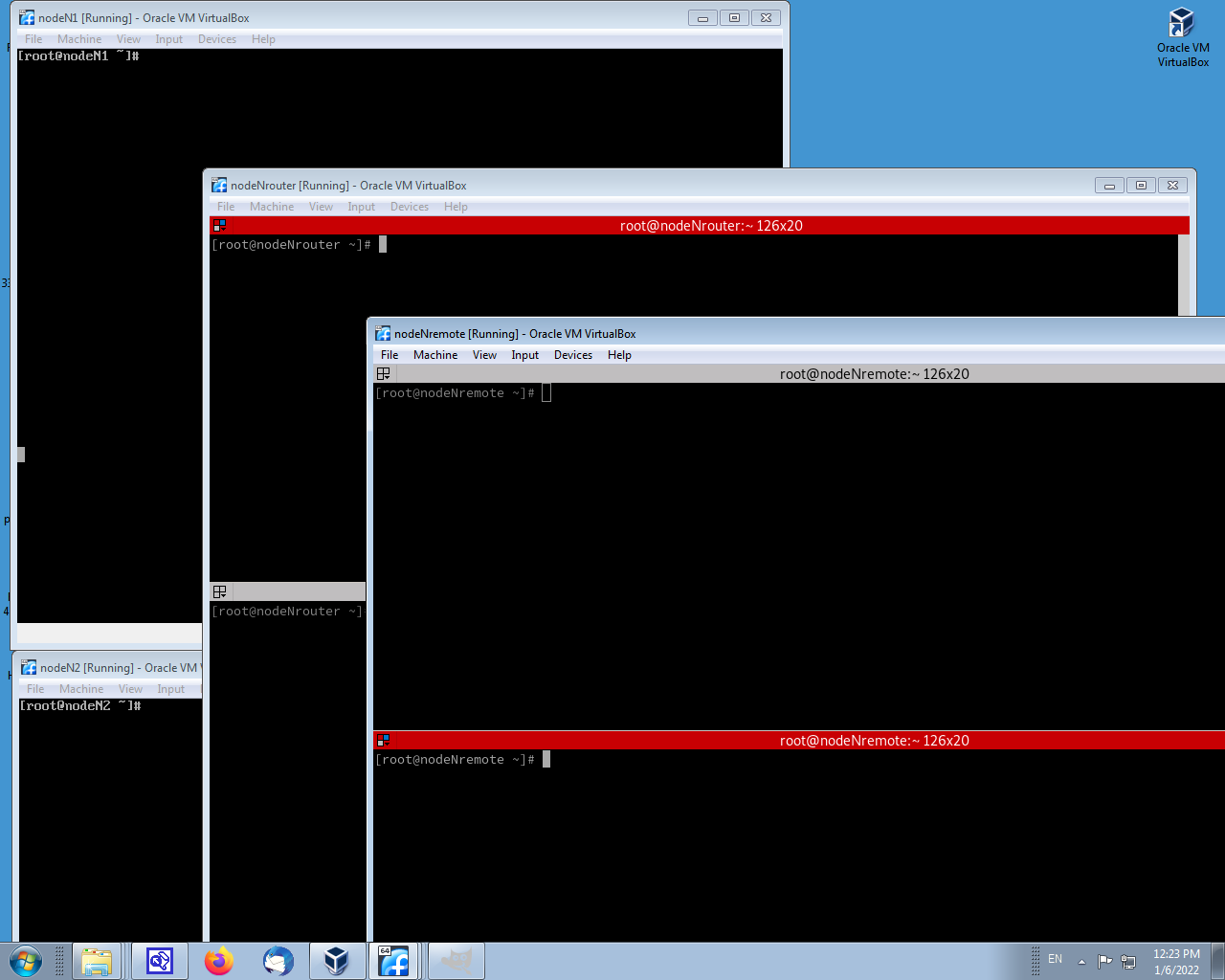 Put the router and the remote machines in graphical mode ( "startx" after logging in as student). Then obtain two stacked terminal windows. Do it by opening a single terminal window, from the terminal window icon under the Activities. In that window become root ( sudo su - ). Then run terminator ( terminator -f & ). In terminator, to split the window horizontally into two windows as shown, press ctrl-shift-O. The other two machines, nodeN1 and nodeN2, can remain in character mode. Log in to them as root.