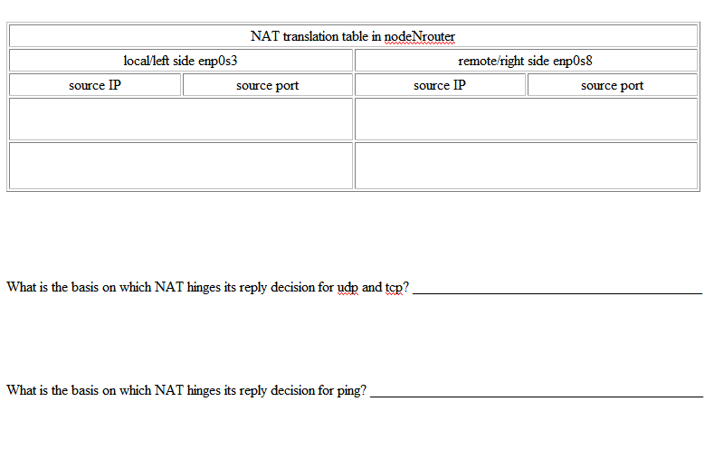 On paper or electronically, edit a copy of this page. Fill in the NAT translation table with the 8 entries it requires to depict the rules it used for the the NATted udp and tcp traffic we ran above, in the same form as Kurose showed in his table. (The values for both the udp and tcp operations are the same, so even though you conducted two operations you can fill in the table just once.) Then, see the questions under the table. These are short-answer questions. Write in their answers (no essays please, nor even sentences). Provide your filled in sheet for me to see in a file named nat-operation.jpg (or .png).