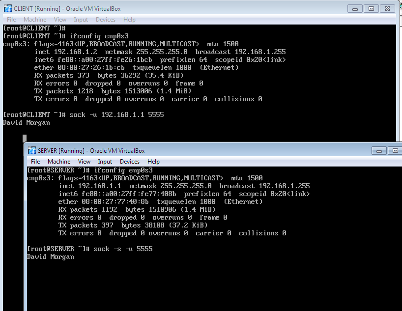 I want a screenshot showing the sock interaction between CLIENT and SERVER that you performed above. Arrange the two VM windows that are on your host desktop in the overlapping manner, and with contents clearly visible that are shown in this example screenshot (but use your name, not mine). Name your screenshot file sock-interaction.jpg (or .png).