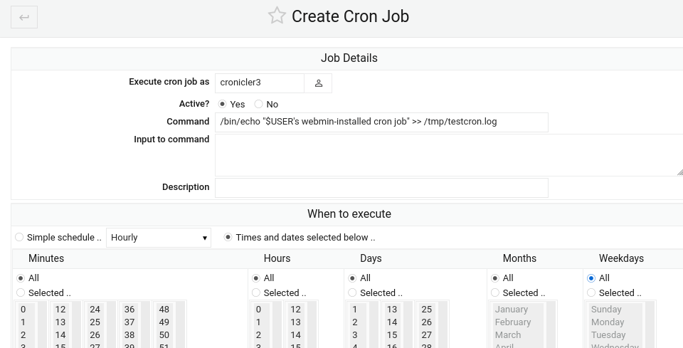Be sure to specify cronicler3, enter the command shown above, click on the the "Times and dates selected below" button, and the five buttons for the time fields (minutes, hours,...) which is equivalent to a manually entered schedule of * * * * * . Then press the "Create" button at page bottom. After the screen refreshes, from within webmin, note the reflection of the new cron job along with the other two you noted before. Note as well, from outside webmin in your character terminal as root: