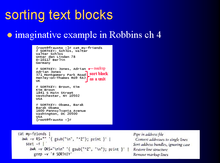 The idea was introduced in the Robbins book. It depended on the insertion to the file of a first line for each block containing whatever key value you wish to sort on. While this is artificial, and requires explicit effort to put the sort keys in place, it also offers flexibility to sort on anything you want. Robbins used the sample text above in a file named my-friends, and a shell pipeline with awk doing all the character substitutions. We however wanted to avoid awk and get the job done by tr and sed instead. This was our strategy: