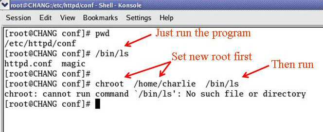 [root@CHANG jail]# /usr/sbin/chroot /home/charlie/jail /bin/ls