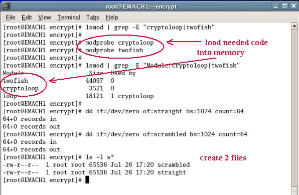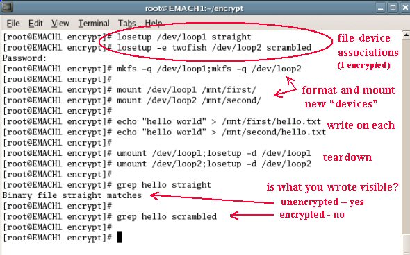 Suppose we want to set this up. First we'll load the module containing code for the twofish encryption algorithm (modprobe command). Then we'll create a file to work with (dd command). We'll associate a device with it, specifying dynamic encryption with the twofish algorithm (losetup command). We'll mount this device for use (mount command). We'll write a file to it. Then we'll unmount and un-loop it (umount and losetup).
