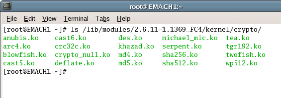 What choices of algorithm do we have? This depends on your distribution. With most, the algorithms are implemented as kernel modules (units of code optionally loaded into memory). The modules come in files with "ko" extension. You can find them in /lib/modules/<kernel version>/kernel/crypto. Here they are from a Fedora Core 4 system: