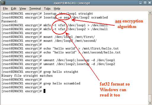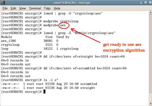 The linux screenshots below show the creation of two file-based filesystems. One is unencrypted, the other encrypted with the aes algorithm. The containing files are named "straight" and "scrambled" respectively. We are interested in scrambled.