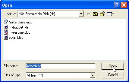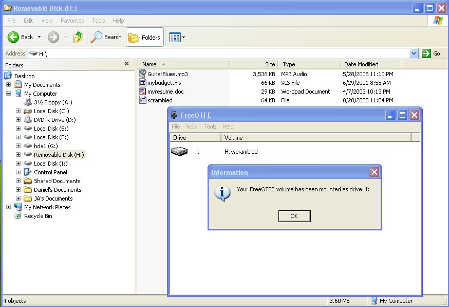 At this point you should be impressed. The file "scrambled" contains within it a whole "disk"! Drive I is inside drive H. Yes, that's the point and why not. A real disk contains a "disk" only because of the structure of its contents, per the rules of FAT or ext2 or NTFS. And since both disks and disk files are generic data containers that can contain anything, a disk file can contain that same thing that a disk normally does, just as well. Notice also that the encryption makes the filesystem in scrambled private and protected, and with it all the files and folders it might potentially contain. The decryption, hence revelation of the contents of drive I, depended on supplying the password to FreeOTFE. The requisite password is the one that was given to the command "losetup -e aes /dev/loop2 scrambled" back in linux, setting up the algorithm and password by which the original encryption was done. Doing the decryption now needs the same.