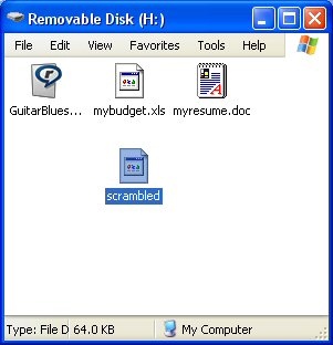 We now have a file whose name is "scrambled," whose size is 64K, and whose content is a filesystem containing a file in its root directory named "hello.txt" holding the phrase "hello world." That filesystem is encrypted using aes and whatever password the user gave in the 3rd line of the above screenshot. So now it's time to plug "scrambled" into a Windows machine. Let's do that by putting it onto a 16MB thumb drive that already has some files on it, and take it to our Windows box.
