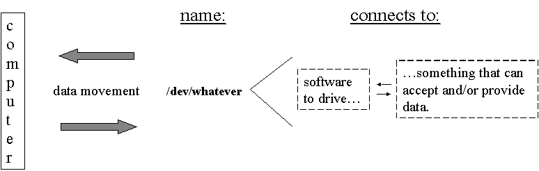 A tradition and truism in the unix world is that "everything is a file." In particular devices are treated as files, reflecting the inherent similarity that both function as data sources and destinations. So a single common mechanism for I/O can be implemented, and serve both. First of all then, devices in unix have their "device files." You can see them sitting right there in the filesystem, in the /dev/directory.