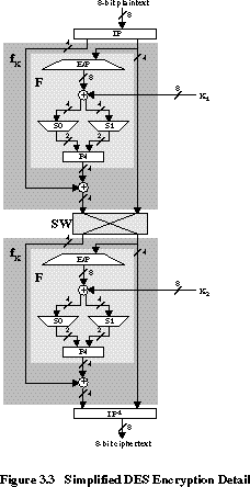 These seven items, IP, IP-1, E/P, P4, S0, S1, and SW are invariant elements of S-DES. They are independent of its key and its input. Below is a diagram of S-DES's operation when encrypting a byte of plaintext. It corresponds to the leftmost column of the previous Figure 3.1, depicting the encryption process, with Figure 3.1's mysterious fK opened up and revealed in the gray boxes. The encircled plus sign symbolizes binary XOR. Notice the appearance at some stage in the diagram of each of the seven elements.